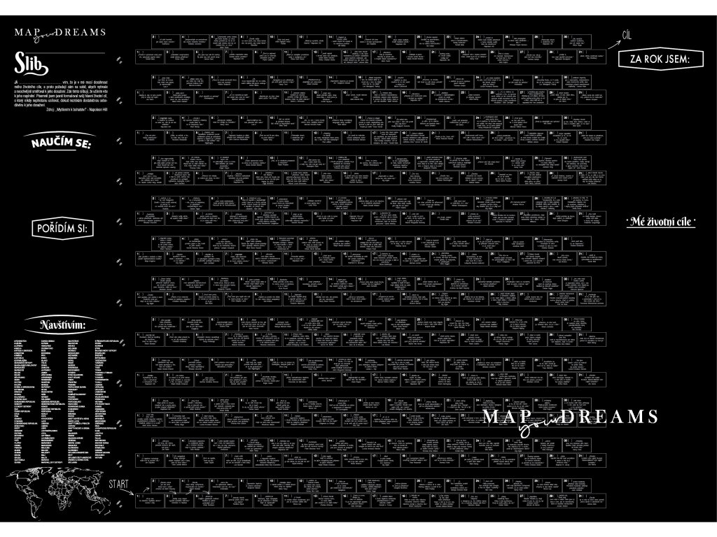 Nech se vést na své cestě za úspěchem. Svou cestu začínáš STARTEM a končíš v CÍLI. Díky systematickému rozložení políček vidíš své cíle přehledně na jednom místě na rok dopředu. Je důležité mít své sny, které si napíšeš pod „Mé životní cíle“, ale stejně tak důležité je mít stanovené krátkodobé cíle. Tzv. si rozlož velké sny na menší kousky.*UPOZORNĚNÍ Nenechávej fixu dlouho otevřenou. Napsaný text nech dostatečně zaschnout.NECH SE VÉST NA SVÉ CESTĚ ZA ÚSPĚCHEM SYSTÉMEM